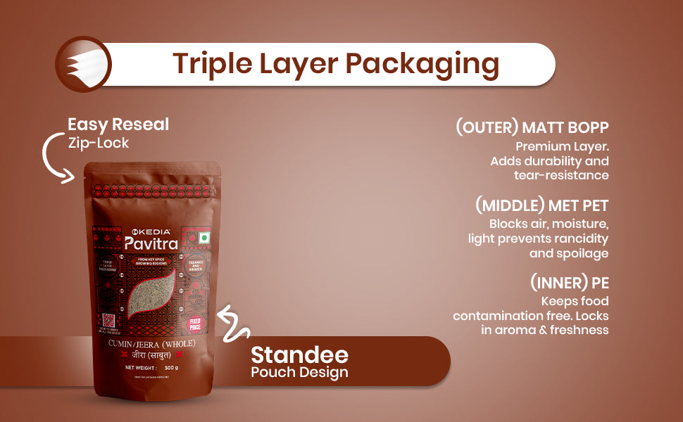 Our cumin seeds are handpicked and packed in a 3-layer pouch with a frosted window to preserve their full sensory profile—aroma, colour, and flavour—without compromise.