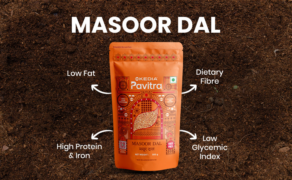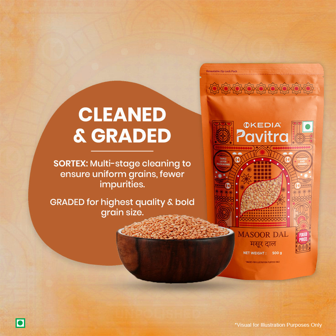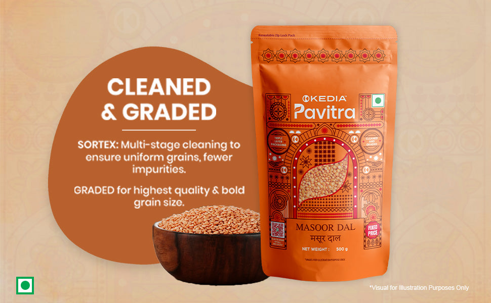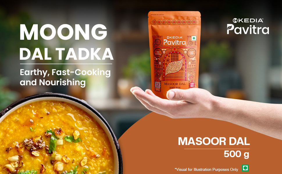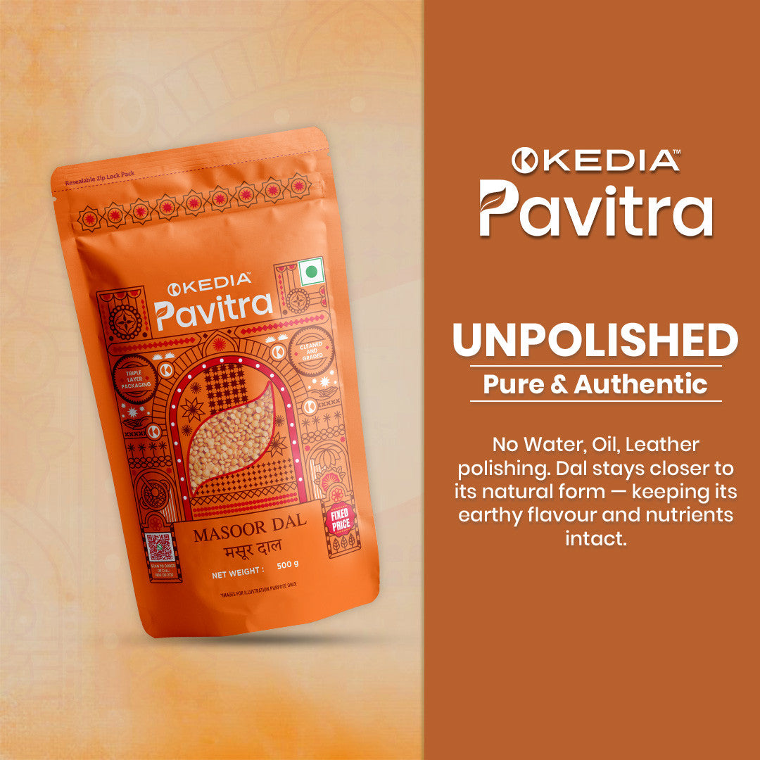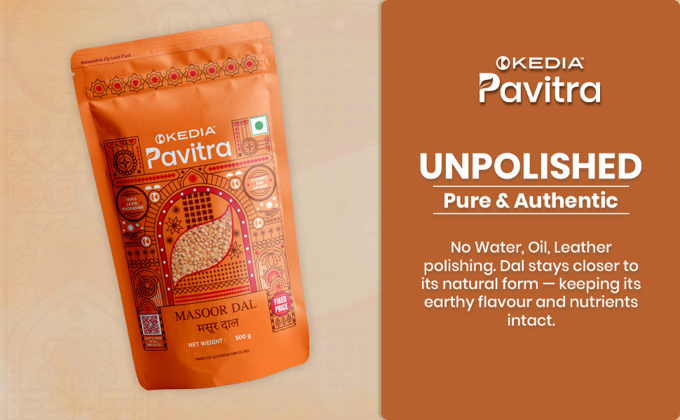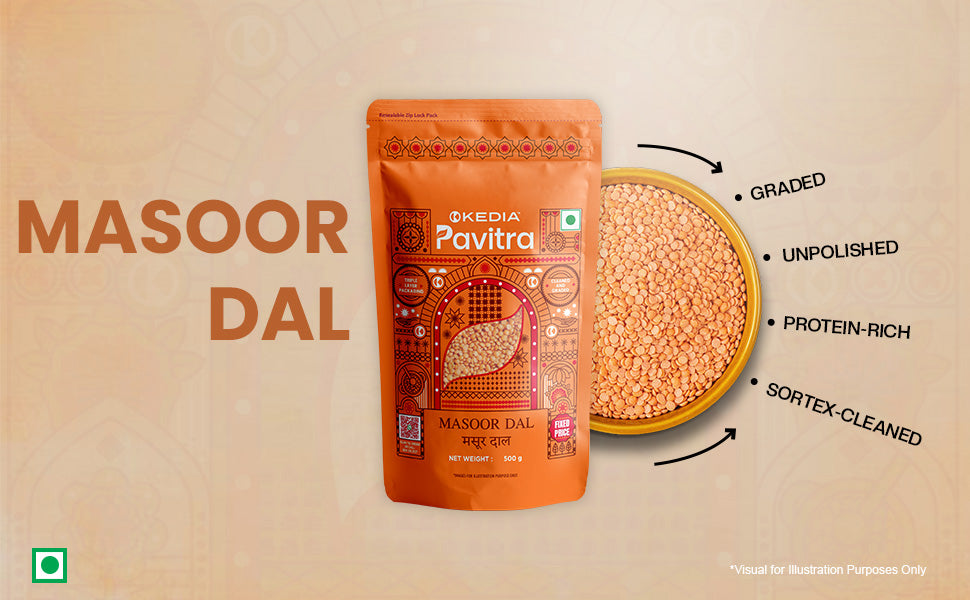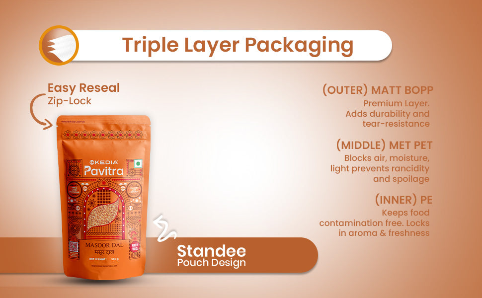 Packed in a triple-layer standee pouch with a frosted window, Masoor Dal retains its natural colour, texture, and nutrition for up to 12 months.