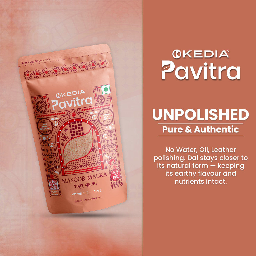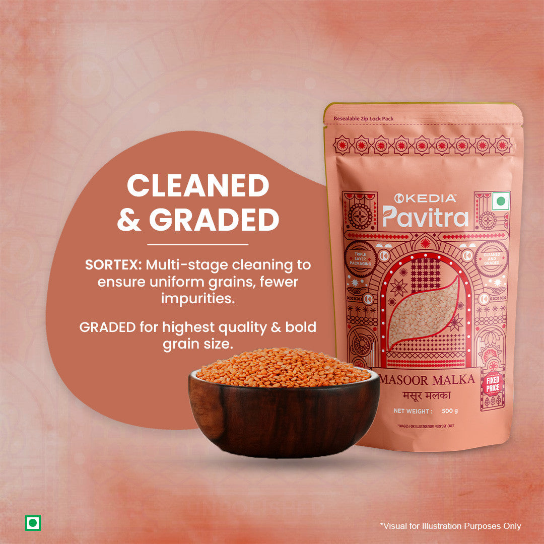 Our Masoor Malka is carefully cleaned and packed in a triple-layer pouch with a frosted window to preserve its full sensory profile—texture, colour, and nutrition—without compromise.