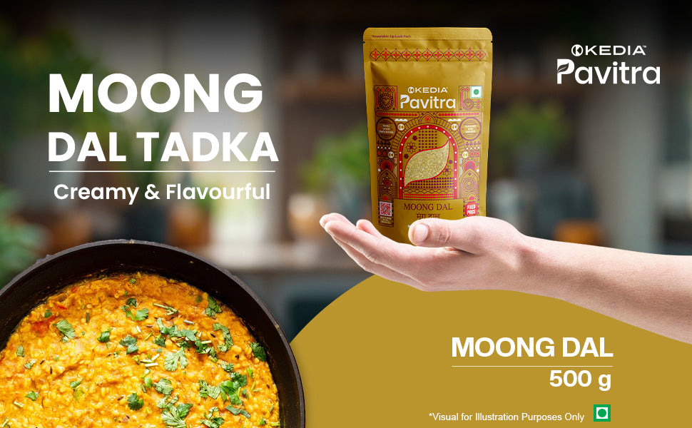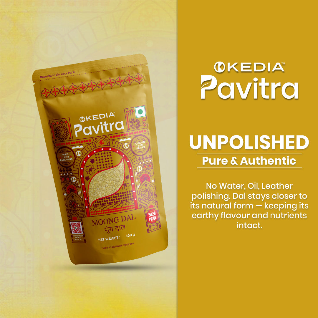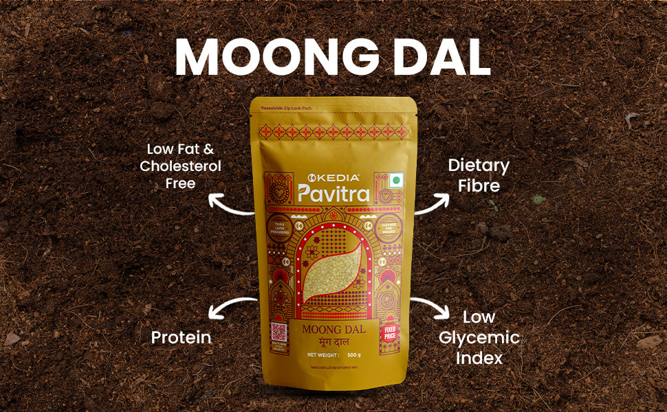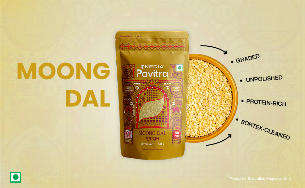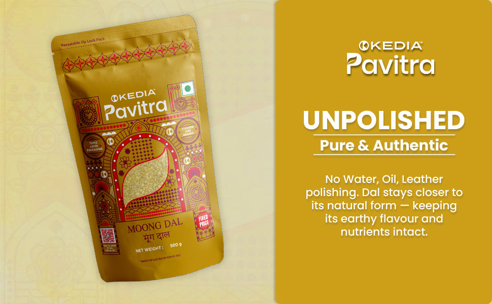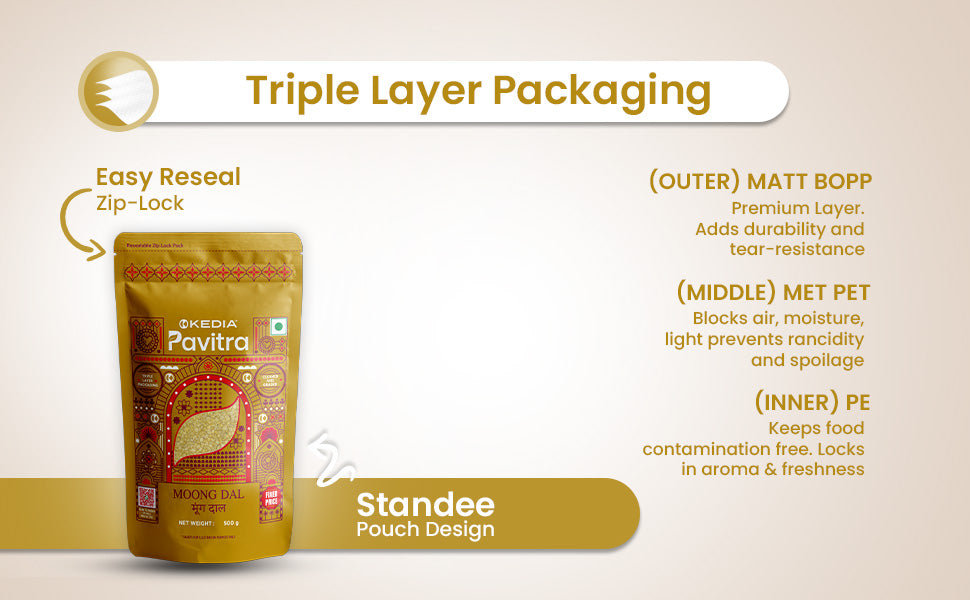Our Moong Dal is carefully cleaned and packed in a triple-layer pouch with frosted window to preserve its full sensory profile—texture, colour, and nutrition—without compromise.