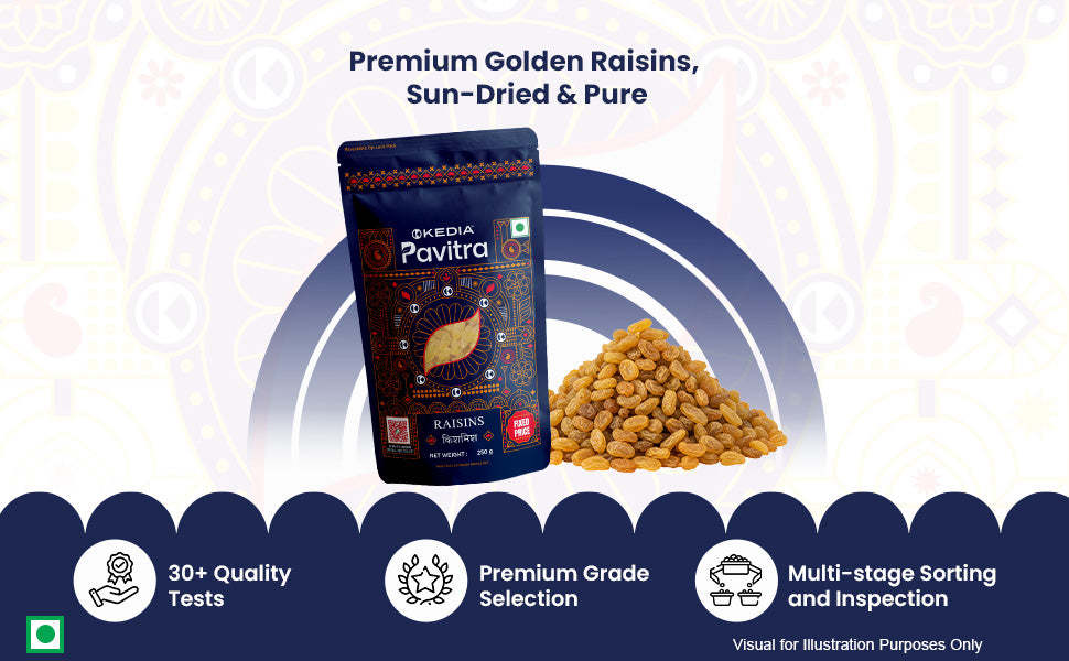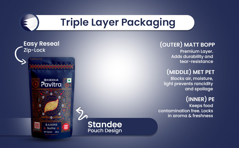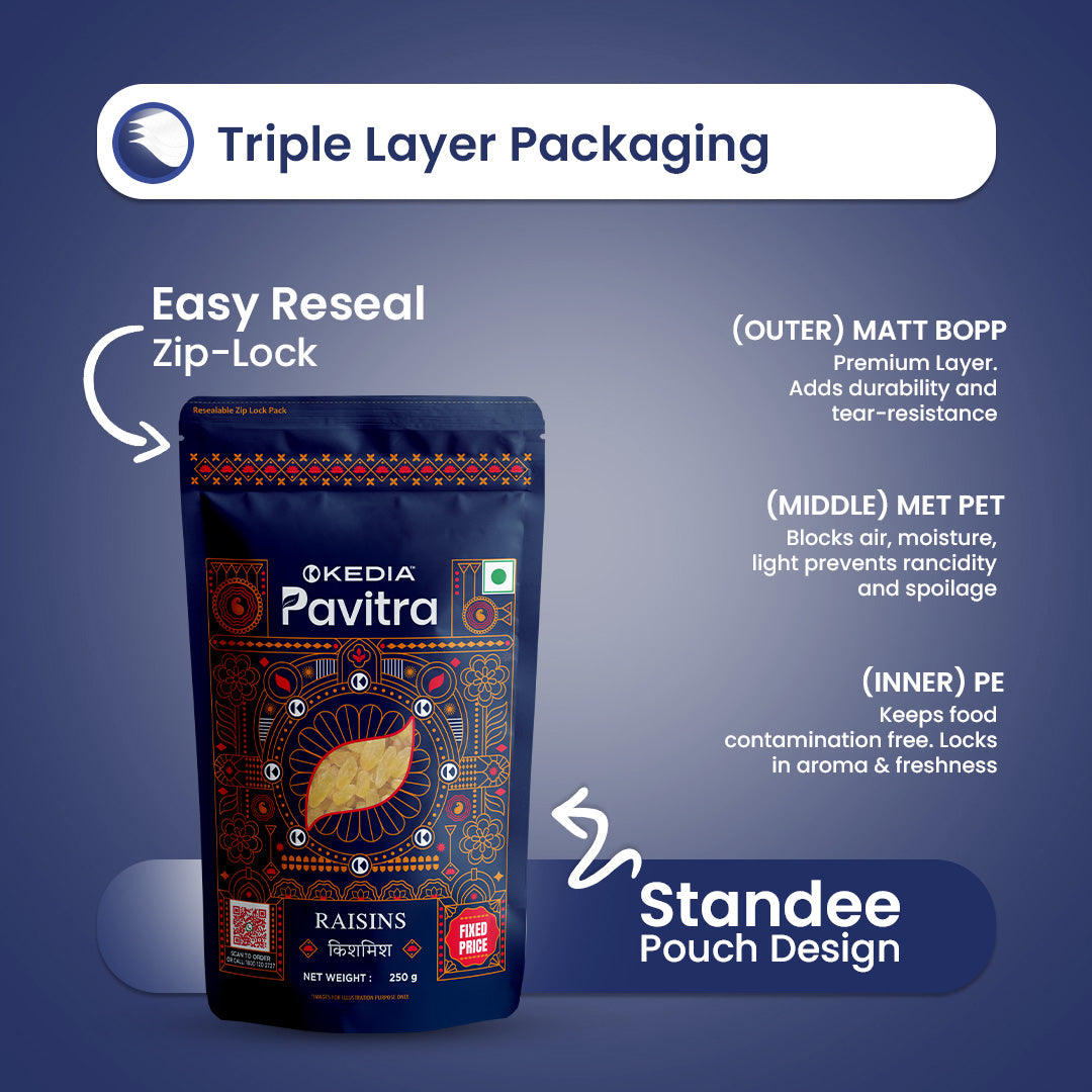 Experience the natural sweetness and soft chew of premium Kishmish, sun-dried without sulphur to preserve its purity and nutritional value. Sourced from select farms and tested across 30+ quality parameters, these whole resins are packed in a zip-lock, multi-layer standee pouch with a frosted window—locking in freshness, aroma, and texture. With no additives or preservatives, Kedia Pavitra Kishmish delivers a wholesome bite that’s naturally rich in antioxidants, essential minerals, and dietary fiber.