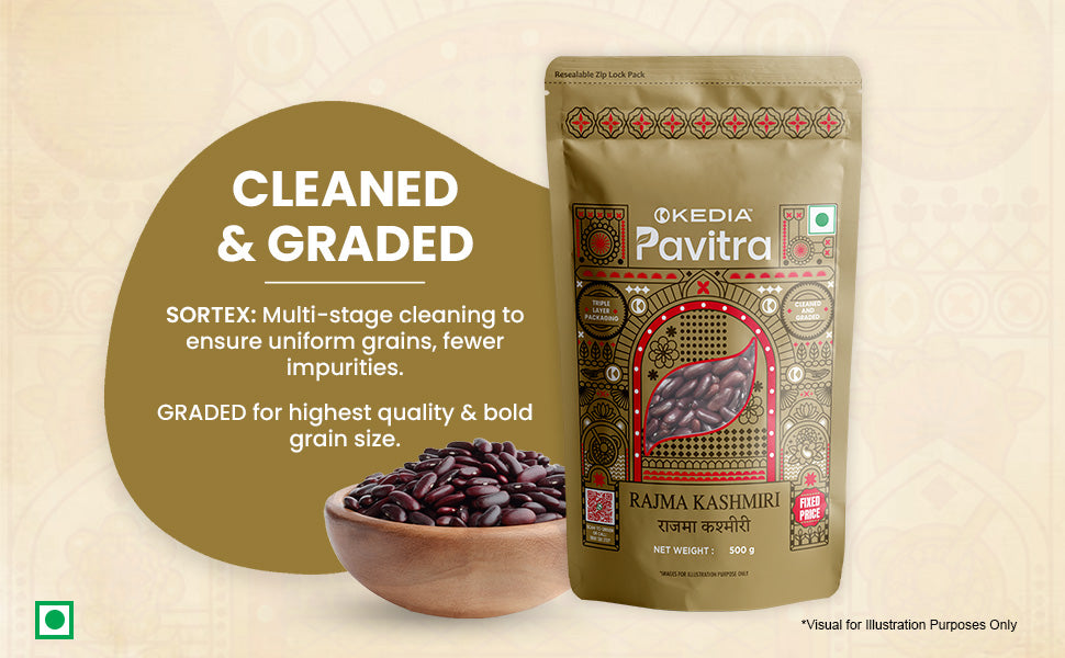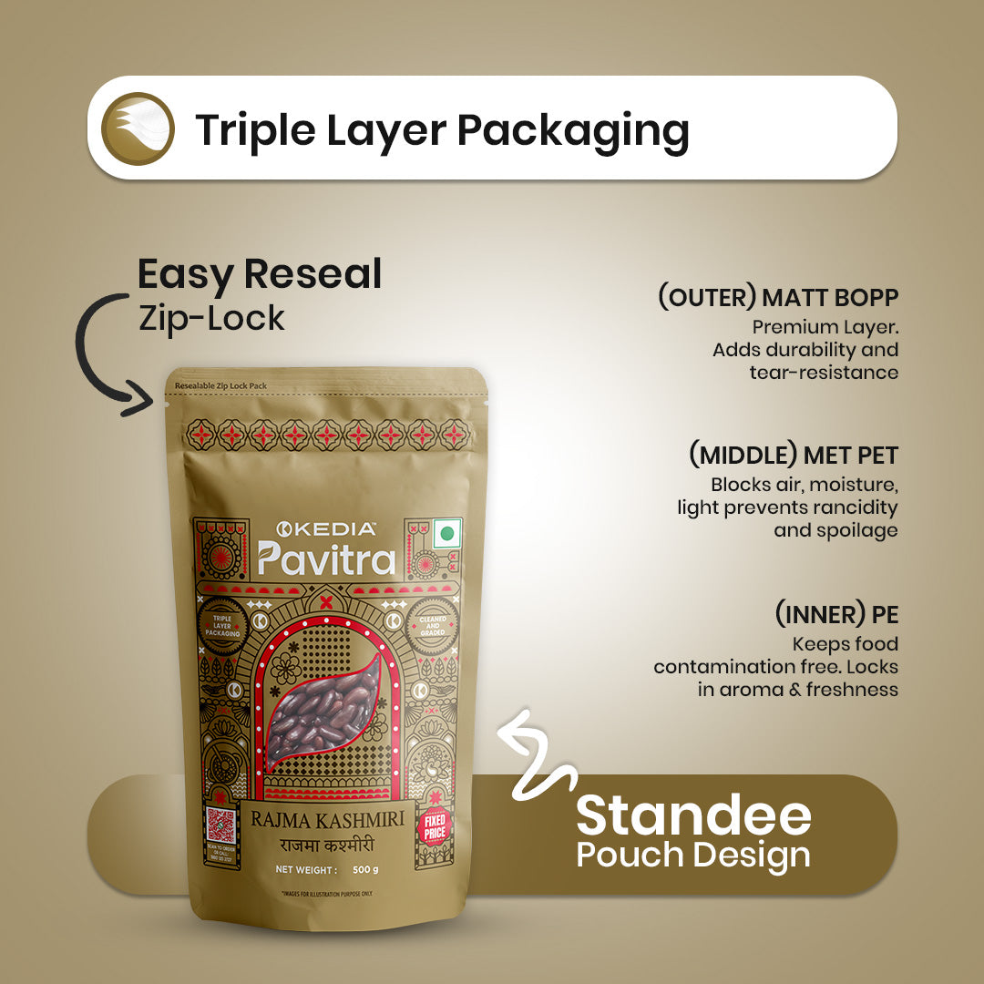 Our Rajma Kashmiri is carefully cleaned and packed in a triple-layer pouch with a frosted window to preserve its full sensory profile—texture, colour, and nutrition—without compromise.