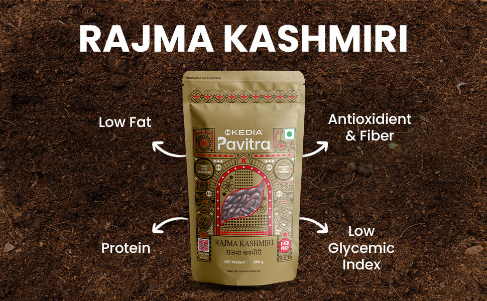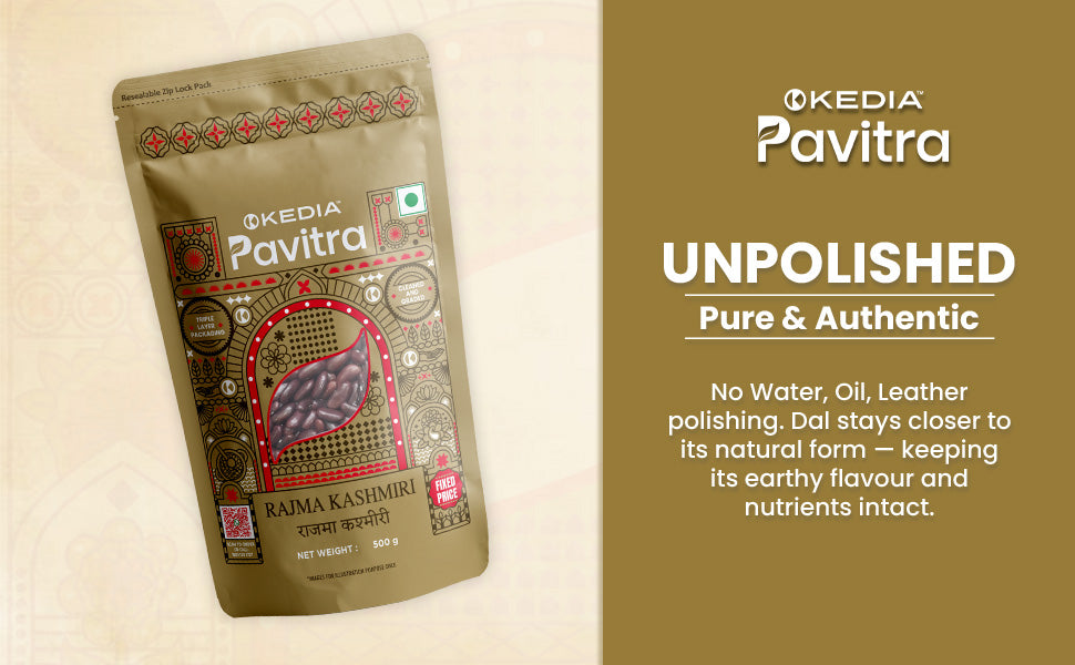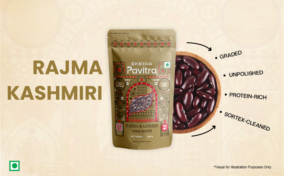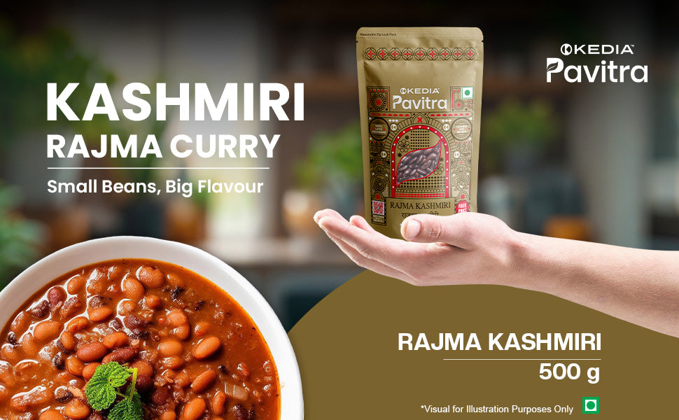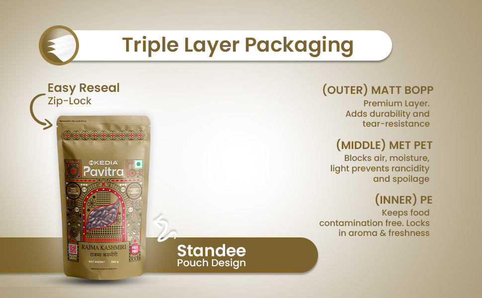 Packed in a triple-layer standee pouch with frosted window, Rajma Kashmiri maintains its creamy texture, colour, and nutrition for up to 12 months.