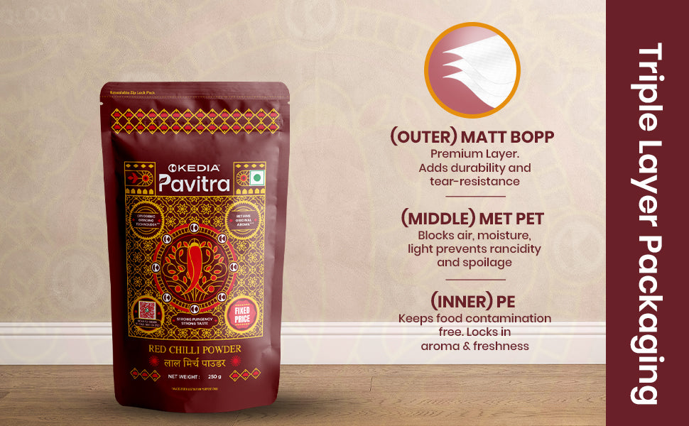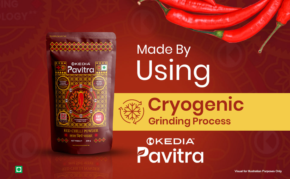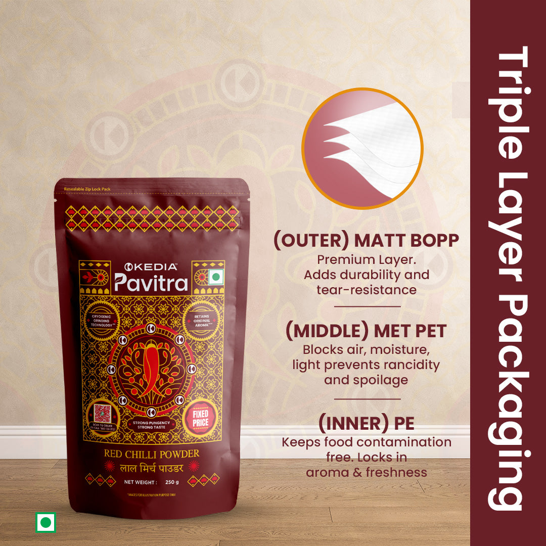 Experience a symphony of heat, colour, and aroma with our Triblend Red Chilli Powder—crafted from a potent mix of Laungiya, Bedgi & Teza. Each variety brings its own magic: Laungiya’s earthy fire, Kashmiri’s rich colour and mellow warmth, and Teza sharp pungency. Cryogenically ground using liquid nitrogen, this blend locks in volatile oils and natural heat for a spice that’s pure, layered, and premium.