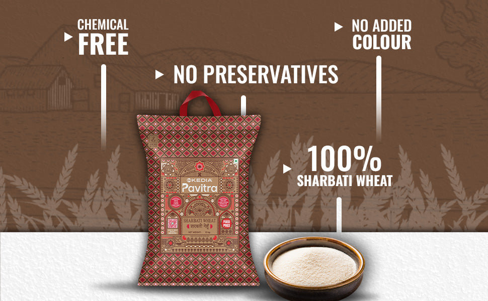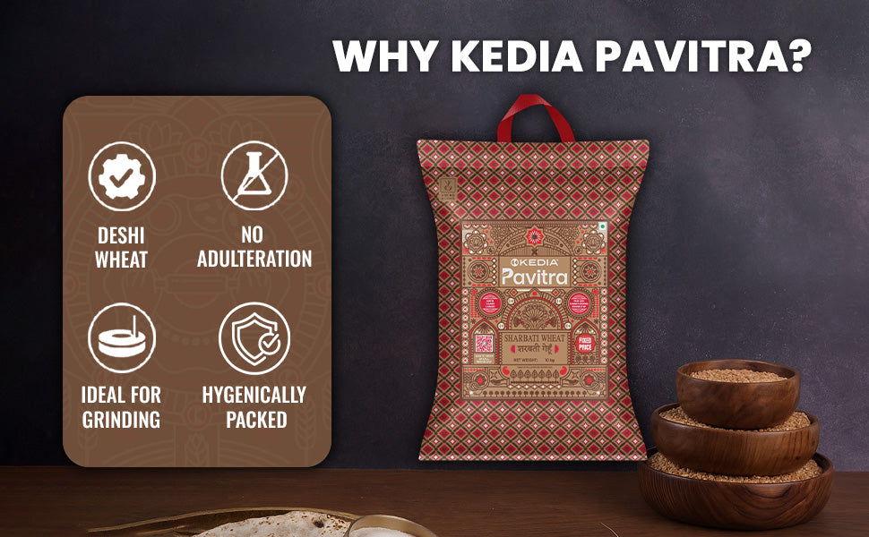 Sharbati Wheat is known for its naturally rich taste and soft texture, making it one of the most preferred wheat varieties for daily cooking. At Kedia Pavitra, we source our Sharbati Wheat directly from trusted farms, where every grain is carefully hand-harvested, naturally sun-dried, and stored under the best conditions to preserve its freshness. With its superior quality and authentic flavor, our Sharbati Wheat is ideal for preparing soft, fluffy rotis and other traditional recipes, bringing a touch of natural goodness to every meal.