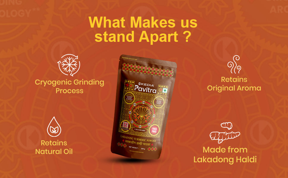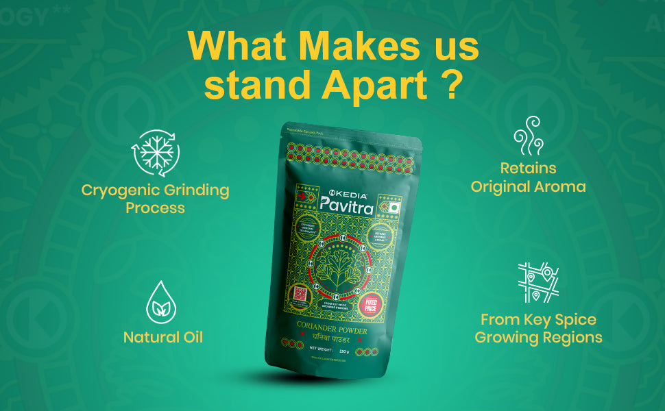 Experience the essence of India's most celebrated spice regions in one thoughtfully curated combo. Featuring the golden power of Lakadong Turmeric from Meghalaya, the citrusy warmth of Ramganj Coriander from Rajasthan, and the bold heat of our Triblend Red Chilli Powder crafted from Assam, Kashmir, and Guntur chillies—this trio delivers depth, purity, and performance in every pinch. Cryogenically ground at ultra-low temperatures, each spice retains its natural oils, aroma, and nutritional value—without thermal degradation or artificial additives. Packed in food-grade, multi-layer pouches, the combo offers an uncompromised sensory experience, backed by origin integrity and quality assurance.
