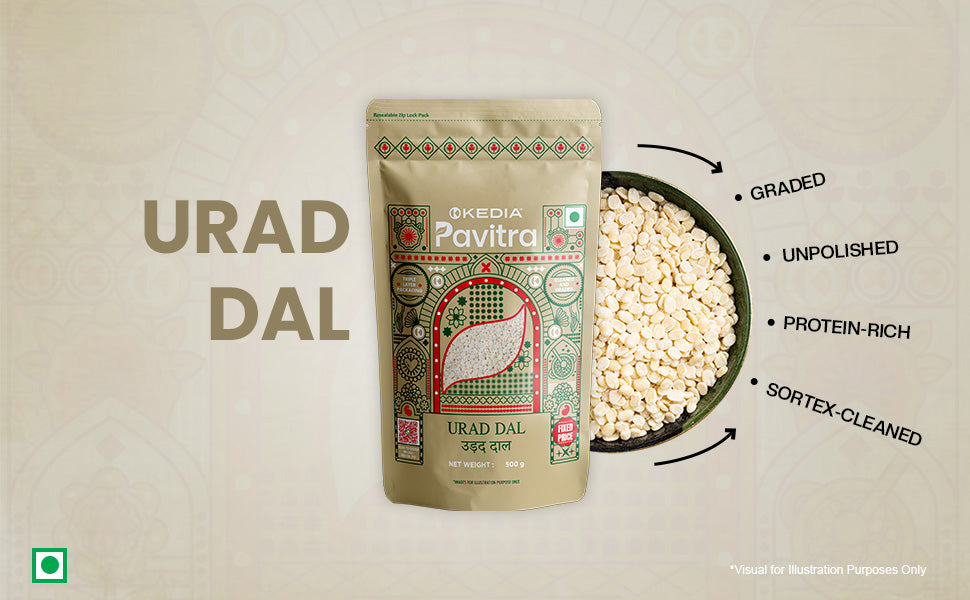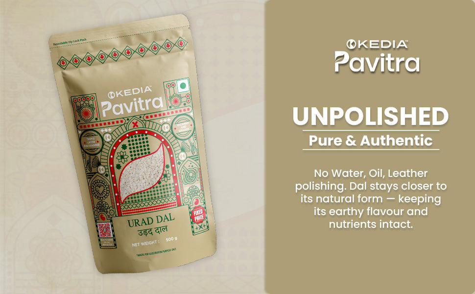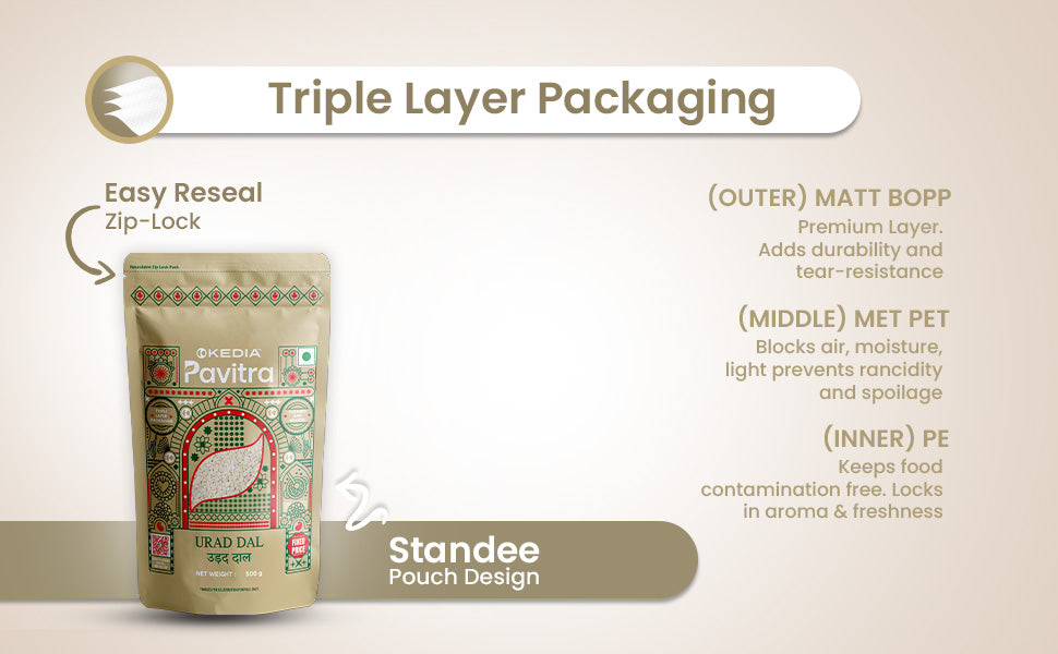 Our Urad Mogar is carefully cleaned and packed in a triple-layer pouch with a frosted window to preserve its full sensory profile—texture, colour, and nutrition—without compromise.