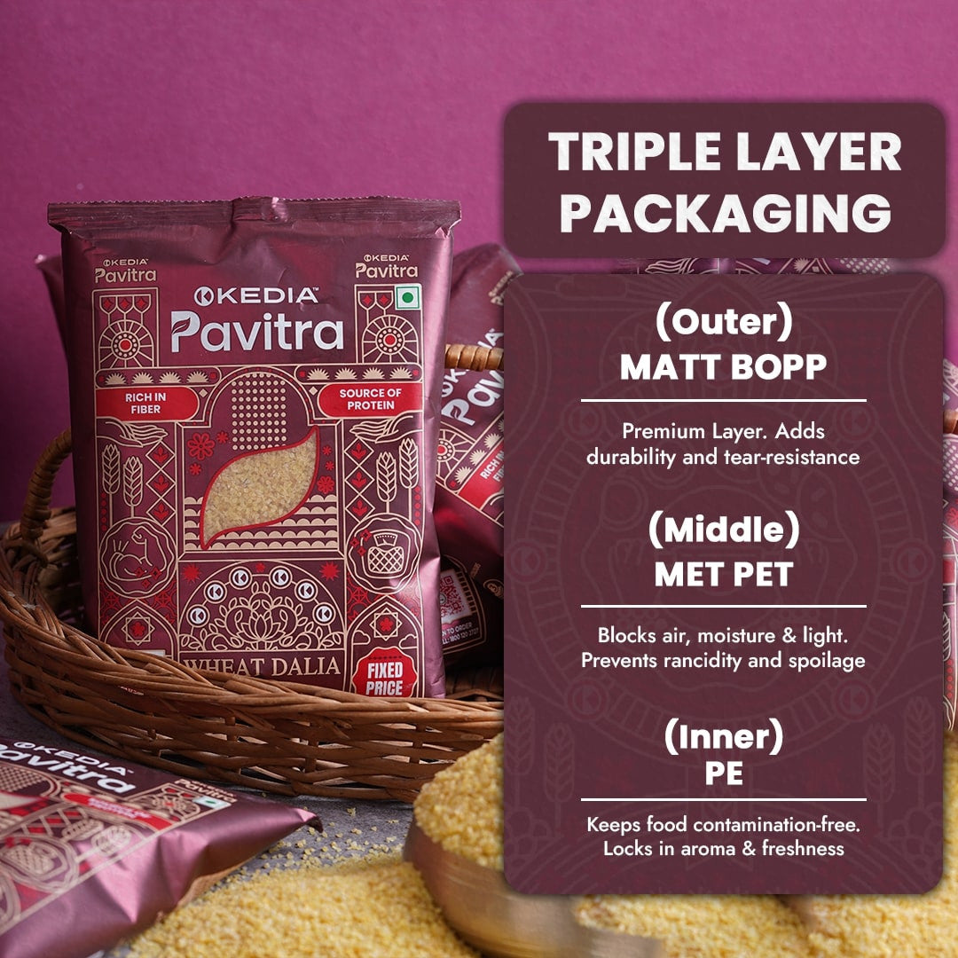 Coarse-textured Daliya is rich in fiber, supporting digestion while adding a mildly nutty flavor. Ideal for soups, khichdis, upma, or porridge for nutritious everyday meals.